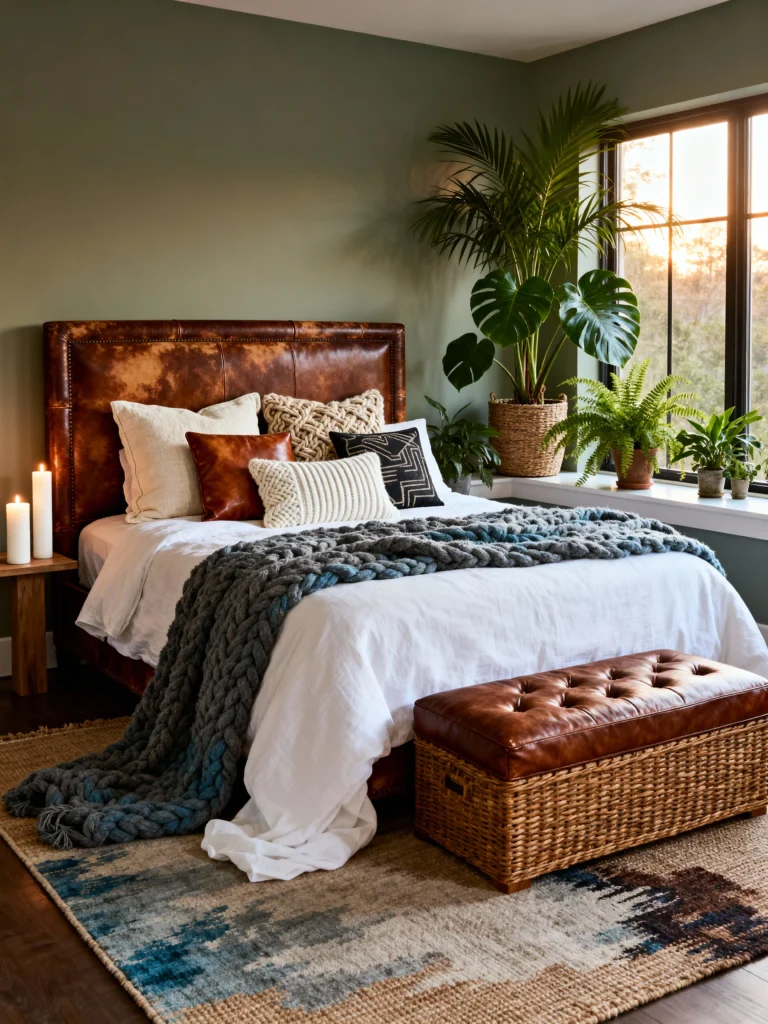 If you want a room that feels “lived-in” but incredibly high-end, this is the blueprint. The star of the show here is that worn leather headboard—it adds an instant sense of history and masculinity that balances out the soft, sage green walls. I love how the chunky, oversized knit throw in slate blue adds a heavy, comforting weight to the bed. It’s the kind of room where you can practically smell the cedar and fresh rain. Pro tip: Don’t be afraid of big plants! That Monstera in the corner really breathes life into the darker tones.