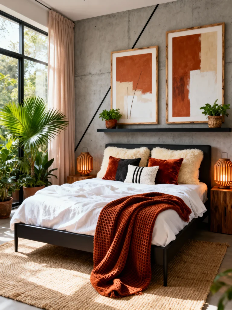 This look proves that “industrial” doesn’t have to mean “cold.” By pairing a raw concrete accent wall with burnt orange linens and warm wood nightstands, you get a space that feels modern yet deeply rooted. The black metal bed frame keeps things sleek, while the shaggy faux-fur pillows add that “touchable” texture we all crave. It’s a perfect example of how to use contrast to create a moody, sophisticated sanctuary.
