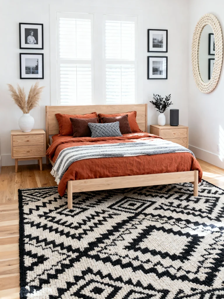 This one is for the lovers of bright, airy spaces with a pop of personality. This room uses a neutral base (white walls and light oak) to let that gorgeous rust-colored bedding really shine. But the real secret sauce here is the pattern play. That bold, black-and-white geometric rug grounds the whole room and gives it a bit of an “art gallery” vibe without feeling stiff. It’s clean, energetic, and feels like a fresh start every single morning.
