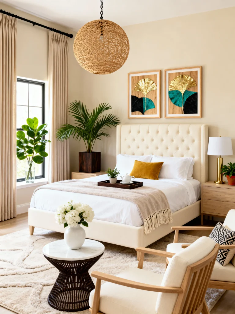 This is “Earthy” with a capital E. The woven globe pendant light is such a statement piece—it draws the eye up and mimics the sun. I’m obsessed with the teal and gold botanical art above the tufted headboard; it’s a clever way to bring in “nature” colors that aren’t just brown or green. The addition of the marble-topped side table and the structured armchairs makes this feel less like just a bedroom and more like a private luxury suite.