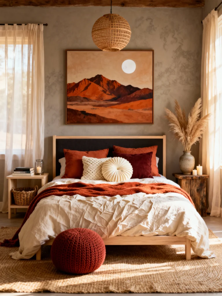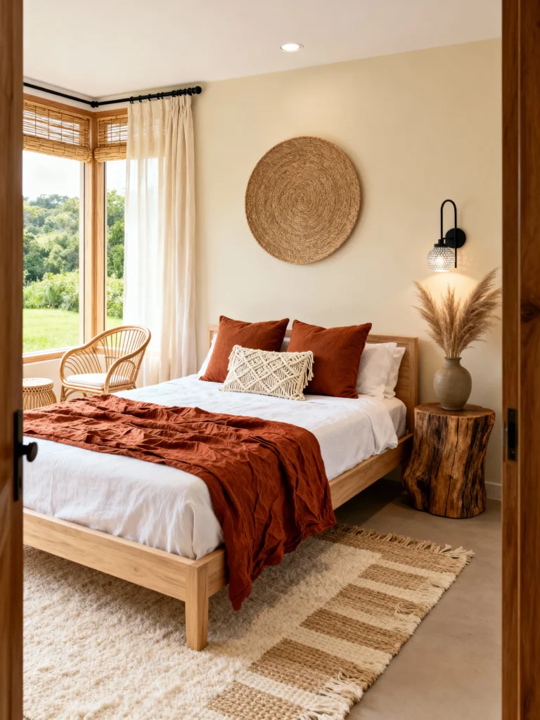 If you’re a fan of the “Boho” look but want to keep it grown-up, look at this setup. That tree-stump nightstand is a literal piece of the forest brought indoors. To keep the room from feeling too “heavy,” the designer used light, gauzy curtains and a macramé accent pillow. The giant woven disc on the wall is a great alternative to traditional framed art—it adds 3D texture and keeps the vibe soft and circular.