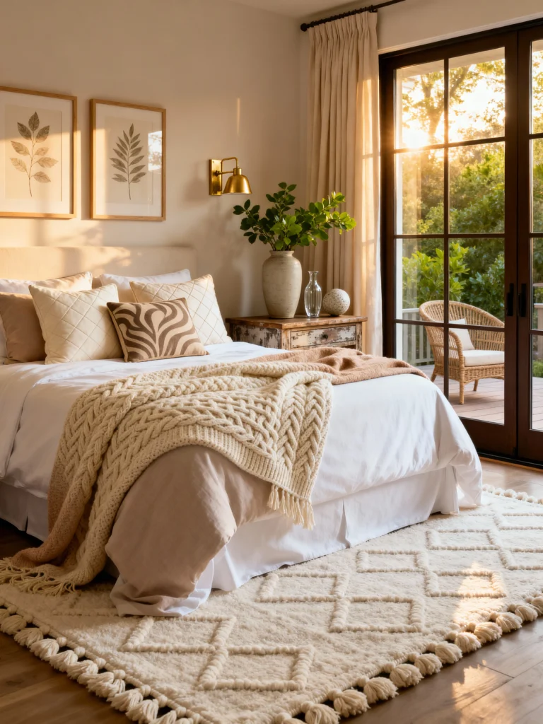 This is the ultimate “slow Sunday” bedroom. The light pouring in through those dark-framed French doors is the best accessory any room could have. By sticking to a creamy, monochromatic palette for the rug and the walls, the small pops of pattern—like the tiger-stripe pillow—really stand out. It’s proof that you don’t need a lot of color to create a space that feels warm and full of life.