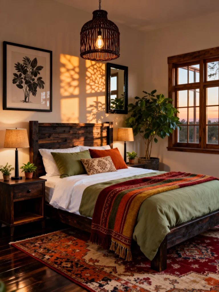 This look leans into a darker, more traditional “lodge” aesthetic. The reclaimed wood headboard has so much character, and the striped, woven blanket gives off a beautiful global-traveler vibe. The warm glow from the lamps creates these amazing shadows on the wall, making the room feel like a cozy cocoon. It’s the perfect place to hunker down with a good book when it’s cold outside.