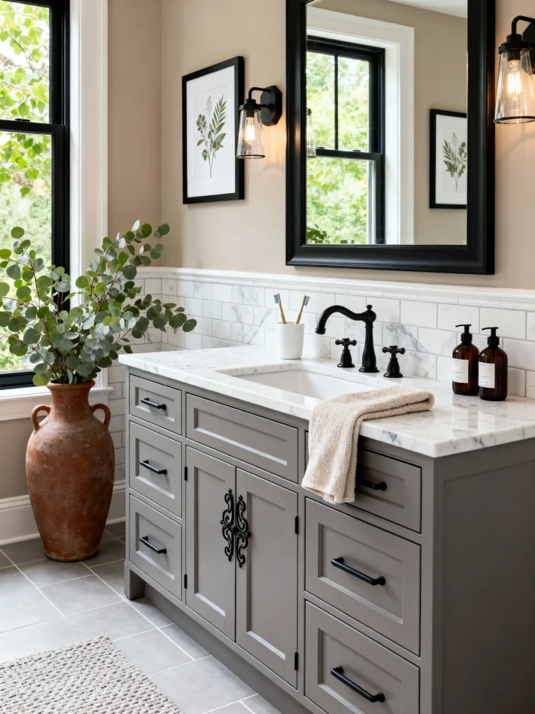 If you love a bit of character, this one’s for you. The ornate black handles on the gray vanity give it a custom, furniture-like feel. Paired with the classic white subway tile and those industrial-style wall sconces, it’s a beautiful blend of old-world charm and modern farmhouse style.
