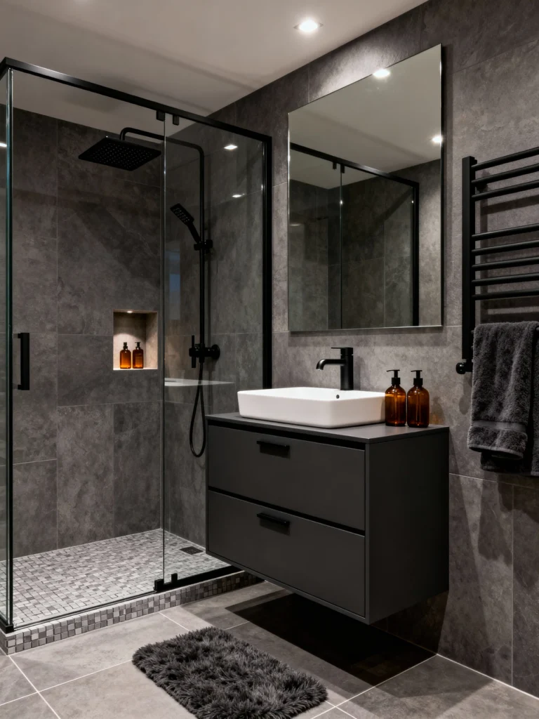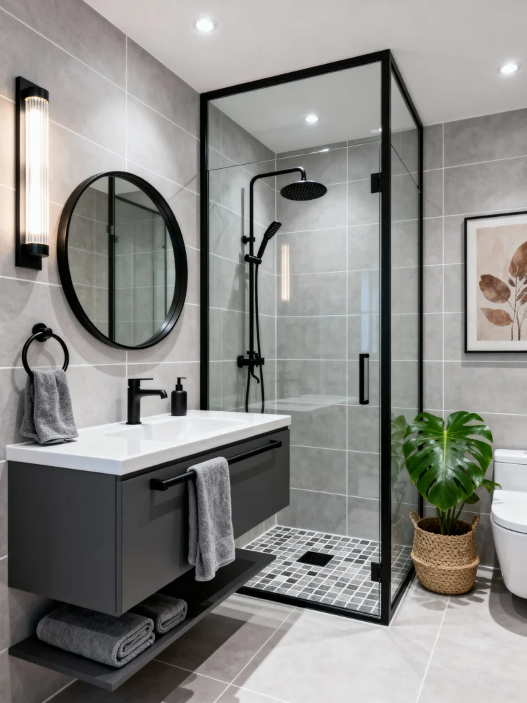 I am obsessed with the “industrial-lite” vibe here. The black frame on the glass shower door ties everything together perfectly, from the faucet to that cool round mirror. The light gray tiles keep the space feeling open, while the dark vanity adds just enough weight. It’s clean, masculine, and super sophisticated.