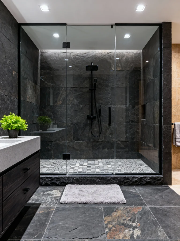 For those who aren’t afraid of the dark side, this moody masterpiece is for you. The floor-to-ceiling slate tiles create such a powerful, cave-like serenity. The black hardware almost disappears into the stone, making the bright green plant on the counter really “pop.” It’s bold, intimate, and very high-fashion.