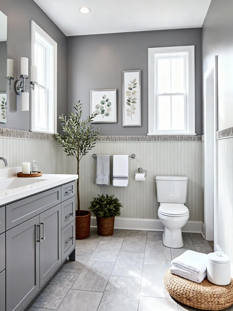 This feels like a breath of fresh air. The vertical shiplap wainscoting and the olive tree in the corner give off major “weekend at the beach” vibes. It’s a classic, timeless look that uses soft grays and whites to maximize light. If you want your morning routine to feel calm and sunny, this is your blueprint.