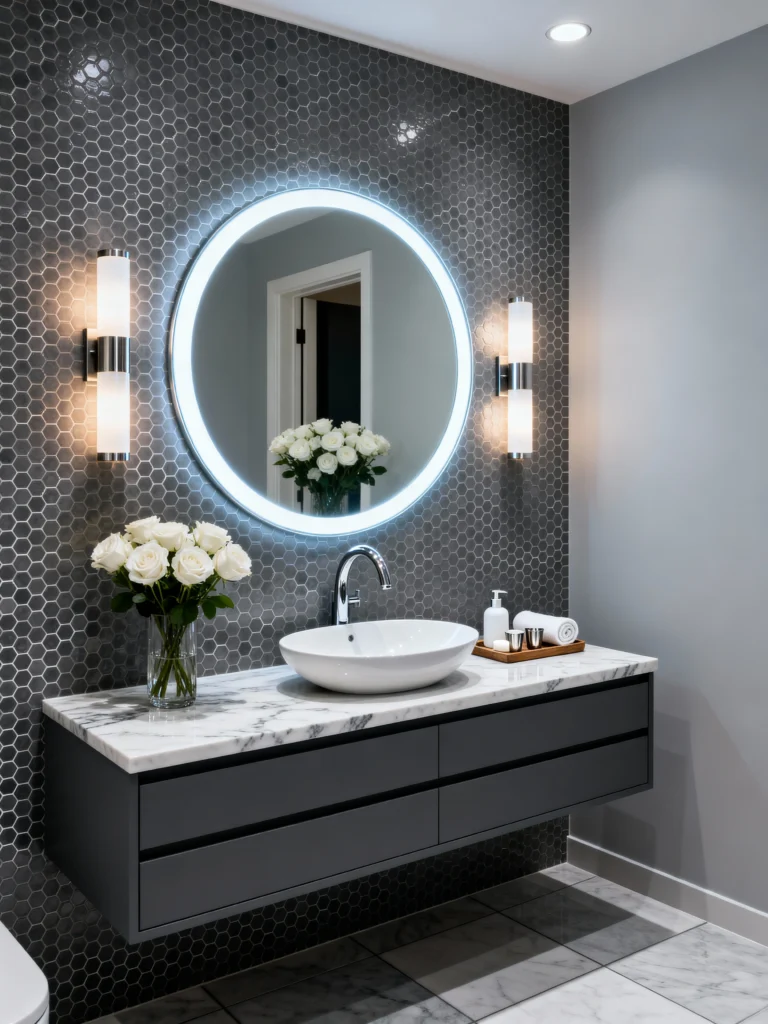 Talk about a “wow” moment! That backlit circular mirror against the dark hexagonal tiles creates such a cool, futuristic glow. It’s perfect for applying makeup or just feeling like a movie star while you brush your teeth. The marble floating vanity keeps it feeling luxurious and light.