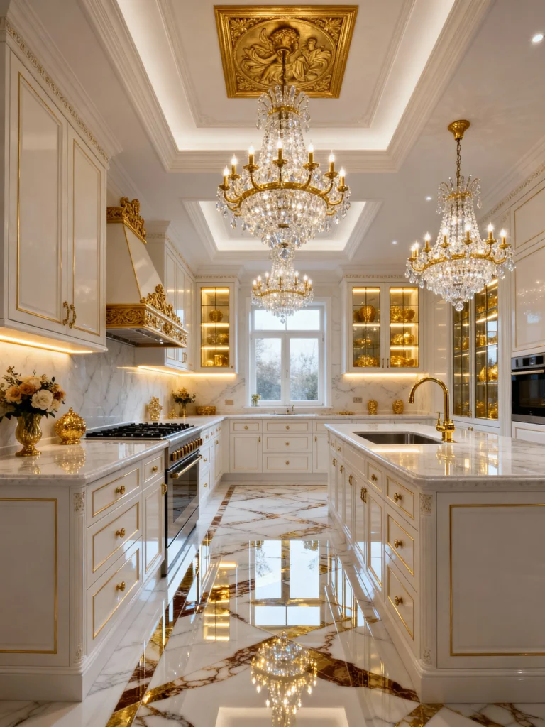 Okay, if you want to feel like royalty while making your morning coffee, this is the one. This kitchen takes “luxury” to a whole new level with those gold accents everywhere. From the handles to the intricate ceiling medallion, it’s dripping in detail. The double chandeliers create such a grand focal point, and those glass-front cabinets with internal lighting? Perfect for showing off your best china. It’s definitely a “maximalist” dream—bright, bold, and incredibly fancy.