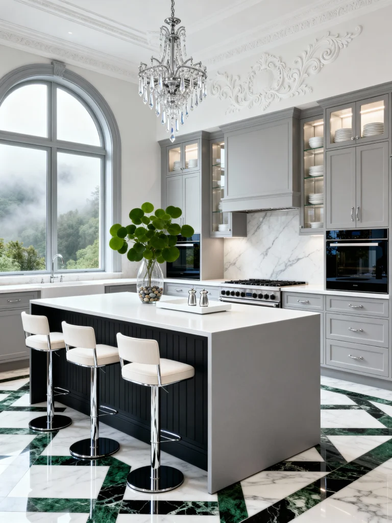 This one is for the lovers of clean lines and high ceilings. That arched window is a total showstopper, bringing in so much natural light. The color palette is a bit more restrained with soft greys and blacks, but that geometric green-and-white marble floor adds all the drama you need. It feels very fresh and updated, especially with those minimalist bar stools. It’s the perfect mix of “historic architecture” meets “21st-century style.”