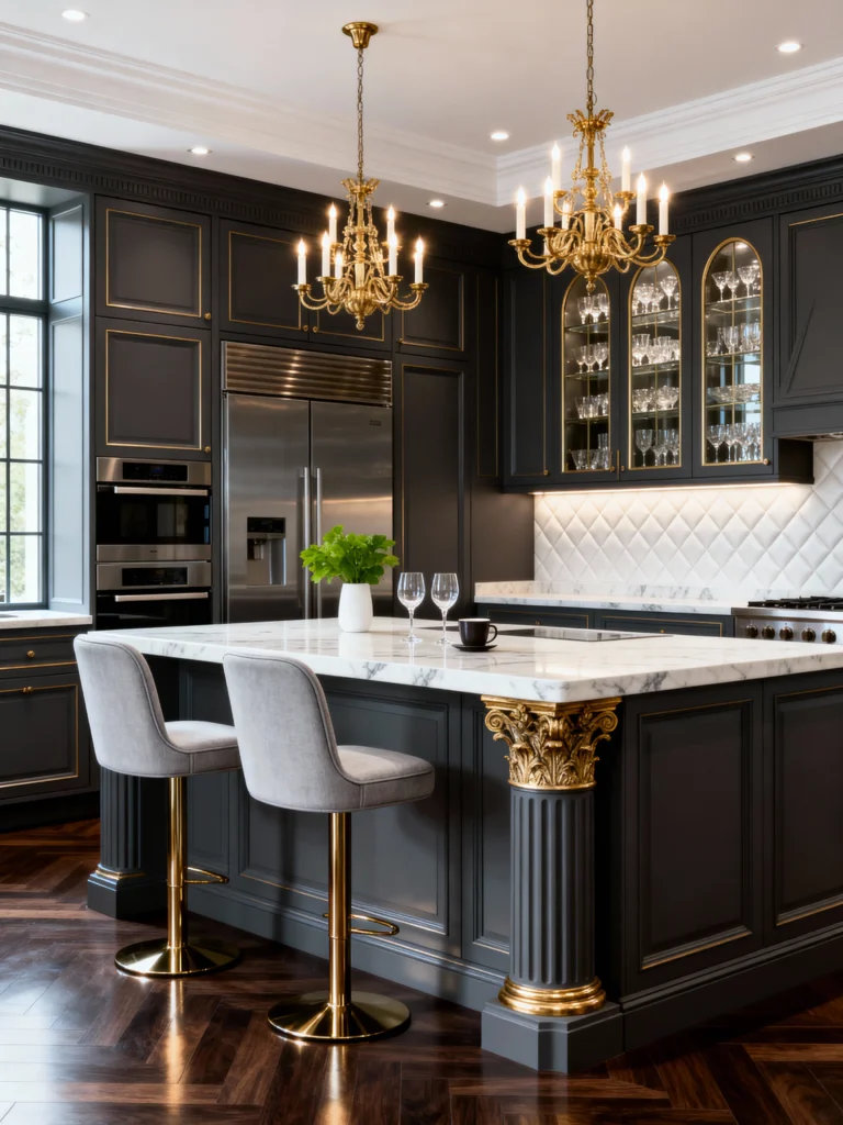 If you prefer something a bit more masculine and sleek, this charcoal grey kitchen is calling your name. The dark cabinetry makes the white marble island really pop. I’m obsessed with the gold Corinthian column on the corner of the island—it’s such an unexpected, regal touch. It’s the kind of kitchen that looks amazing at night with the under-cabinet lighting glowing. It’s chic, sexy, and very “city penthouse.”