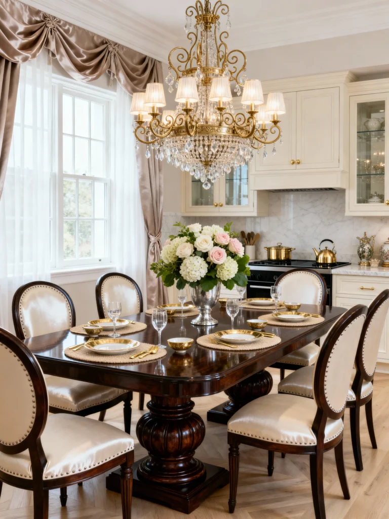Technically, this is where the cooking ends and the eating begins! This dining area is the height of elegance. The dark wood table is stunning, especially when set with gold-rimmed plates. The satin-finish chairs look so comfortable for a long dinner party. I love how the drapes match the tones of the room—it’s very cohesive and polished. It’s the perfect spot for a holiday meal or a fancy Sunday brunch with friends.