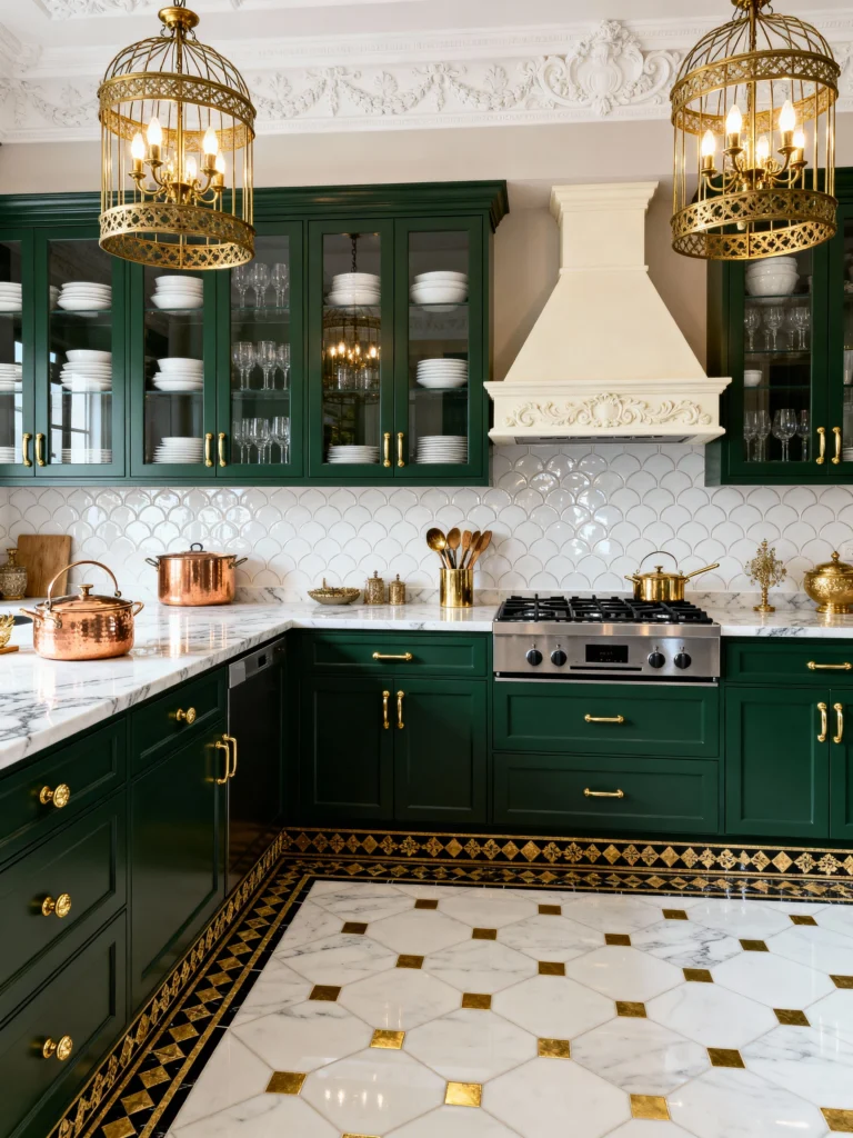 Can we talk about this green? It is so moody and gorgeous! Deep forest green cabinets are such a huge trend right now, and pairing them with gold hardware is just chef’s kiss. The backsplash has this cool “fish scale” or scallop pattern that adds a lot of texture without being overwhelming. And look at those birdcage-style pendant lights! They add such a whimsical, vintage touch to a very high-end space. This kitchen has so much personality.