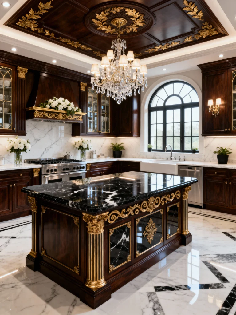 Talk about a statement! This kitchen is all about rich, dark wood and heavy gold carvings. It feels very traditional and expensive. The contrast between the dark walnut cabinets and the bright white marble floors keeps the room from feeling too heavy. That coffered wood ceiling is incredible—it’s not something you see every day! This is definitely a kitchen for someone who loves formal, historic design and isn’t afraid of a little drama.