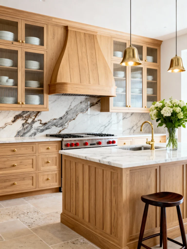 After all that drama, this light oak kitchen feels so grounded and peaceful. The vertical wood slats on the island and the matching wooden range hood give it a very Scandinavian, organic vibe. It’s clean and modern, but the wood grain keeps it feeling natural and “earthy.” Those brass bell-shaped lights are the perfect finishing touch. If you want a kitchen that feels like a calm sanctuary, this is definitely the path to take.