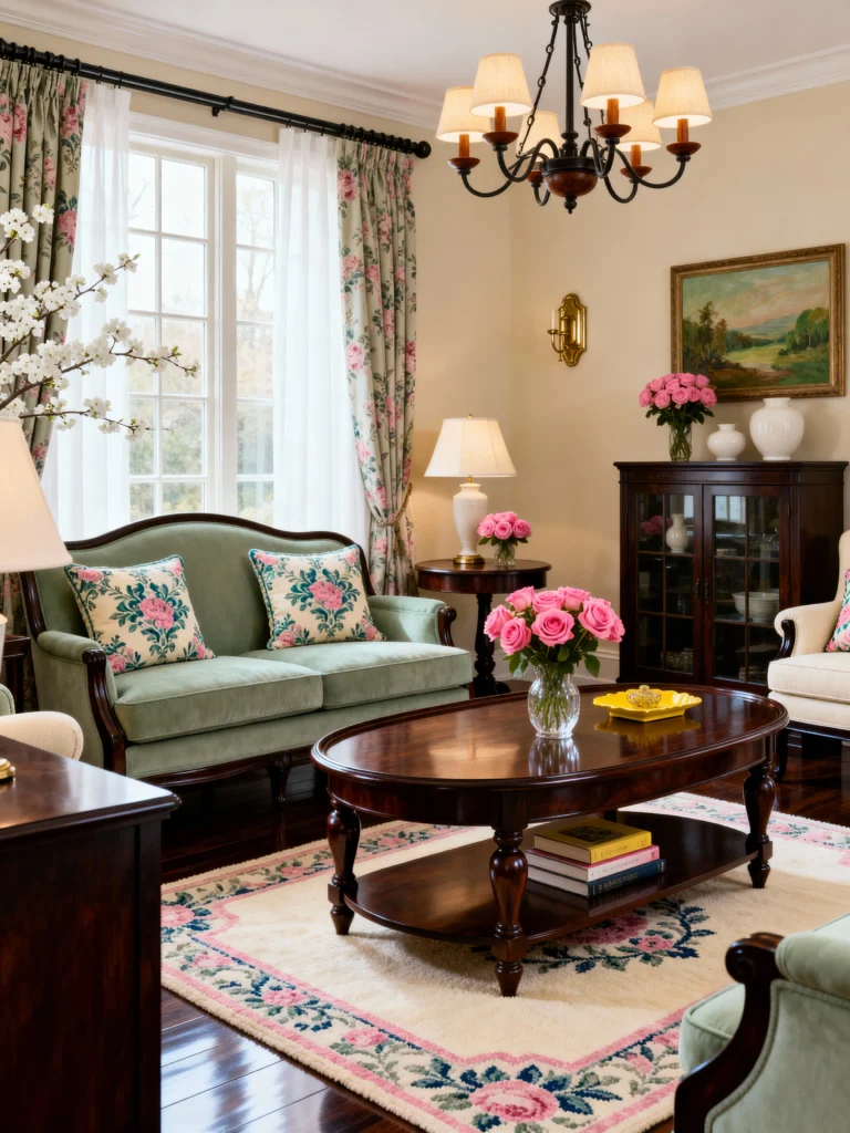 If you want to know what “cozy luxury” looks like, this is it. This living room feels like a warm hug from a very sophisticated friend. That sage green velvet sofa is the absolute star—it’s plush, inviting, and pairs so perfectly with those floral accent pillows. I love how the curtains bring in a bit of a garden vibe, making the whole room feel fresh. The dark wood coffee table adds just enough weight to keep things grounded, and those pink roses? They’re the perfect pop of color. It’s the kind of spot where you could spend hours reading or catching up with a neighbor.