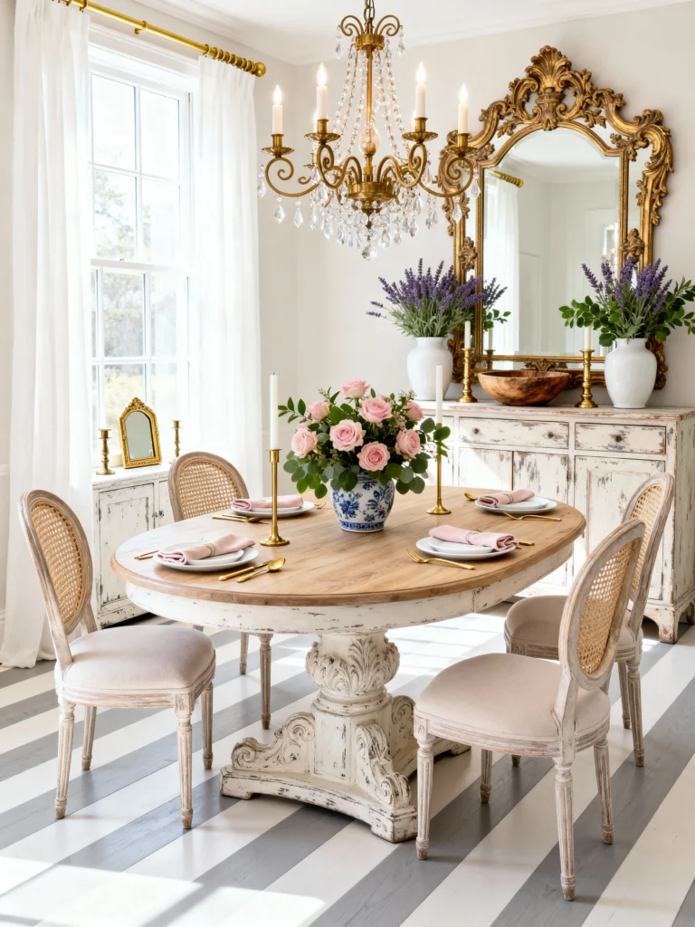 For our final stop, we have a room that feels a bit more “shabby chic” but still totally elegant. I love the distressed finish on the table and sideboard—it adds so much character and makes the room feel less precious and more “homey.” The cane-back chairs are a classic choice that never goes out of style. The striped floor is a bold move, but because the colors are neutral, it actually makes the room feel longer and more modern. It’s a beautiful blend of old-world style and fresh, creative design.