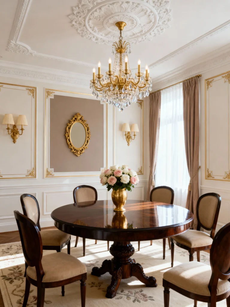 Now, this is a dining room that’s ready for a celebration! There is something so incredibly timeless about a round, dark wood table—it just encourages conversation, doesn’t it? The gold accents here are what really elevate the space, from the ornate wall sconces to that stunning oval mirror. And can we talk about that chandelier? It’s like jewelry for the ceiling. Even though it’s formal, the soft beige tones in the rug and chairs keep it from feeling “stiff.” It’s elegant, polished, and totally ready for a fancy dinner party.