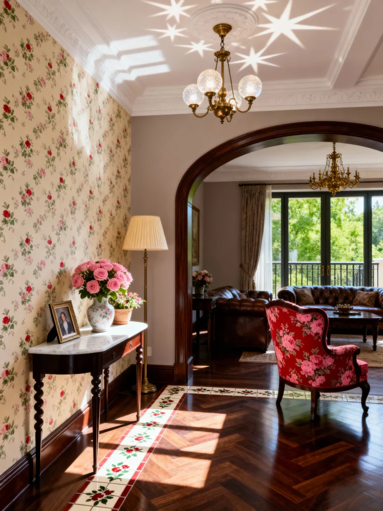 First impressions are everything, and this hallway definitely delivers. I’m obsessed with this wallpaper—it’s classic, feminine, and makes the whole entry feel like a vintage dream. The dark wood archway leads your eye right into the cozy lounge beyond, but the real hidden gem here is the floor. Look at that rose-patterned tile border! It’s such a clever way to add detail to a beautiful herringbone wood floor. Between the fresh bouquet of pink roses and the star-shaped light patterns on the ceiling, this space feels magical.
