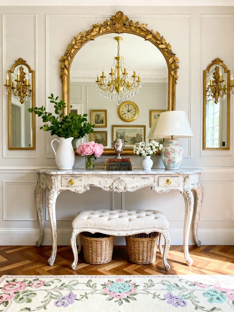 If you have a blank wall and aren’t sure what to do with it, let this be your guide. This vignette is a masterclass in balance. That distressed white console table is stunning on its own, but when you top it with a massive gold leaf mirror and those matching sconces, it becomes a total focal point. I love the mix of textures here—the smooth marble top, the wicker baskets tucked underneath, and the soft tufted ottoman. It’s a mix of “shabby chic” and “royal palace” that somehow works perfectly together.