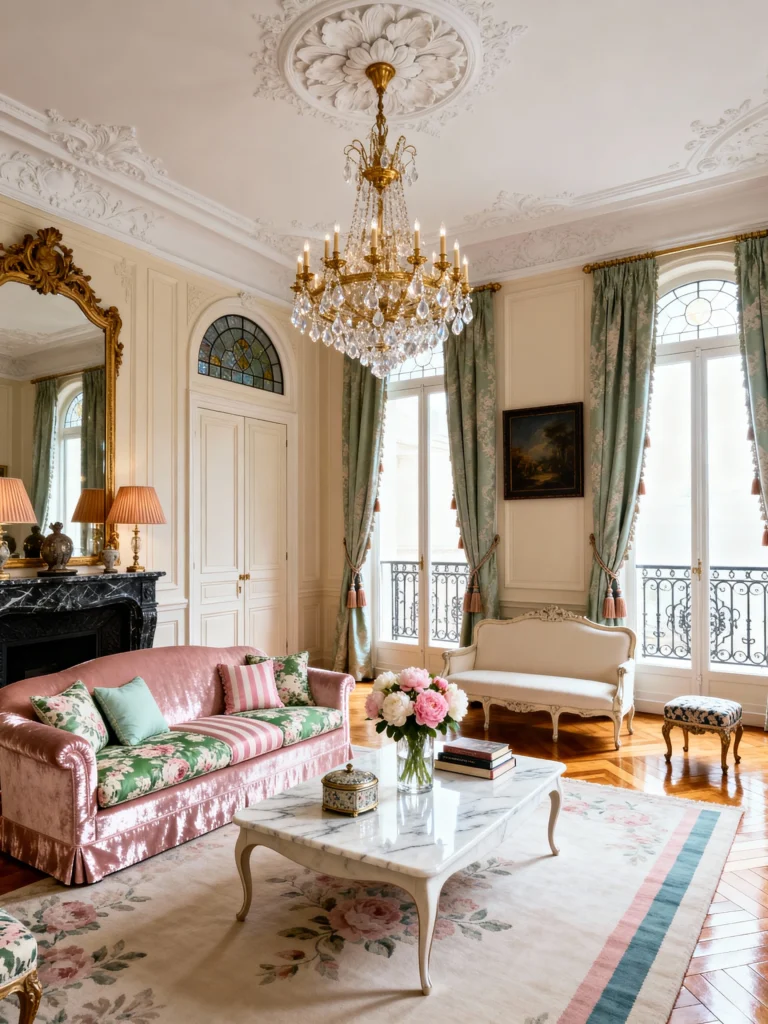 This living room is giving me major Parisian apartment vibes! That blush pink velvet sofa is a total showstopper, especially with the mix of floral and striped cushions. It’s playful but still feels very high-end. The marble coffee table and the massive gilded mirror over the fireplace are classic staples, but the real “wow” factor is the architecture. Those high ceilings with the ornate molding and the tall French doors letting in all that natural light? It’s a literal dream. It’s the perfect place to sip some bubbly and feel fancy.