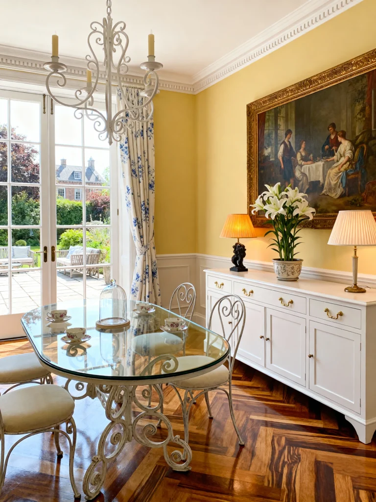 I am a sucker for a room with a view, and this dining area is spectacular. The yellow walls make the whole space feel like it’s permanently filled with sunshine. That wrought-iron glass table is a great choice here because it feels “light”—it doesn’t block the view of that gorgeous herringbone floor or the garden outside. The blue and white floral curtains add a bit of a French country twist that makes the room feel approachable and lived-in. Imagine having your morning coffee here while looking out at the greenery!