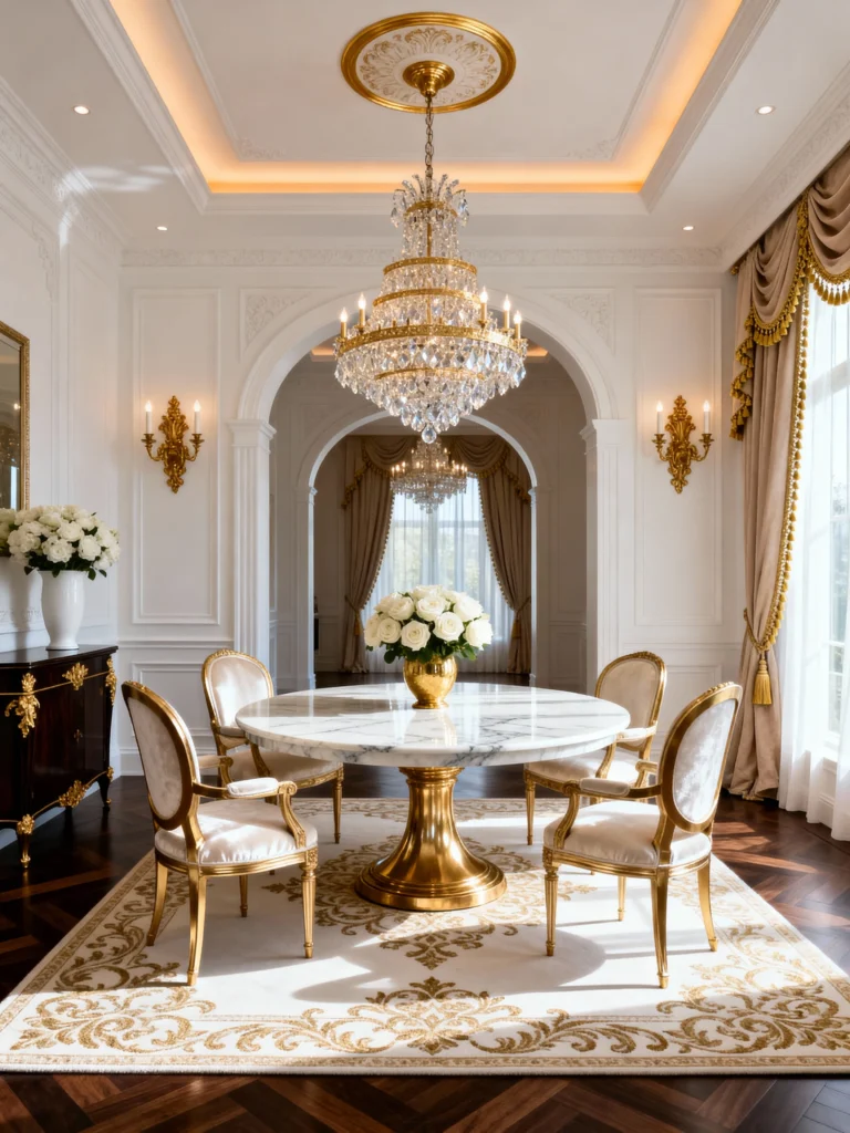 This dining room is pure opulence. If you love the “all-white” look but want it to feel warm, this is how you do it. The gold-plated chairs and table base add so much richness to the white marble and cream walls. The architecture here is what really shines—the recessed ceiling with hidden lighting and those beautiful arched doorways create so much depth. It’s very symmetrical and balanced, which gives it a calm, grand feeling. Those white roses in the gold vase are the perfect final touch.