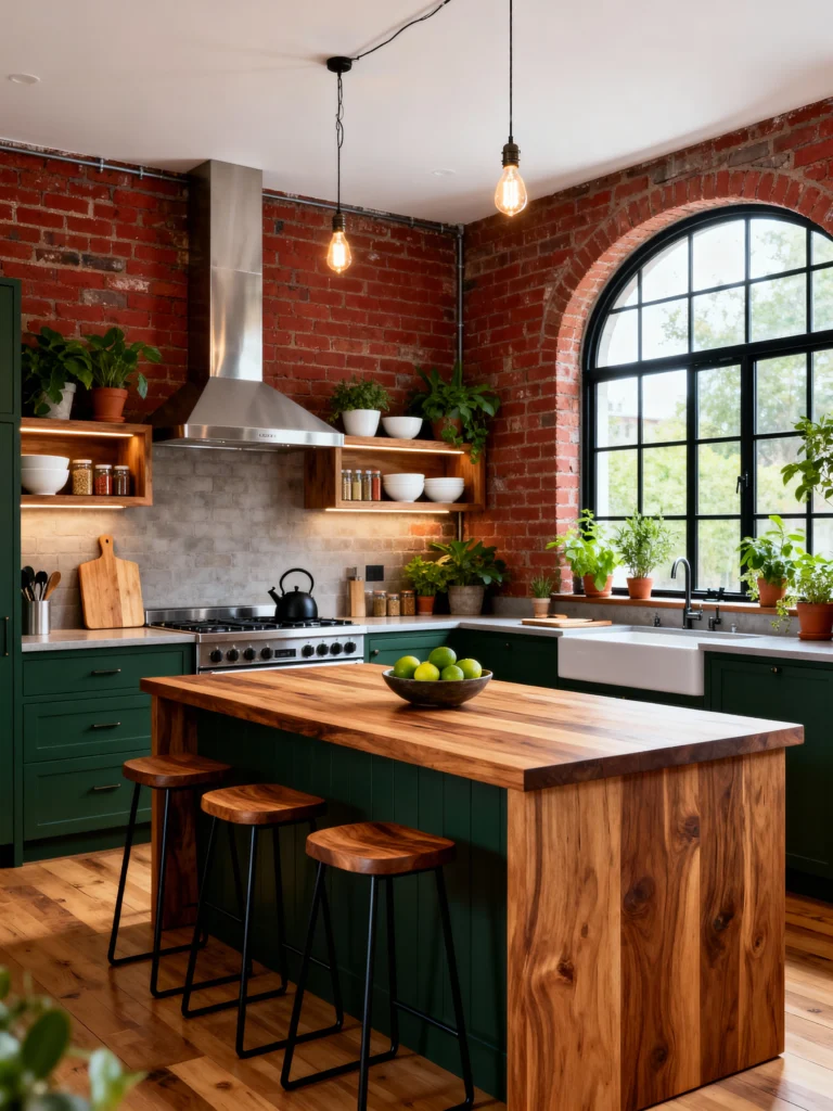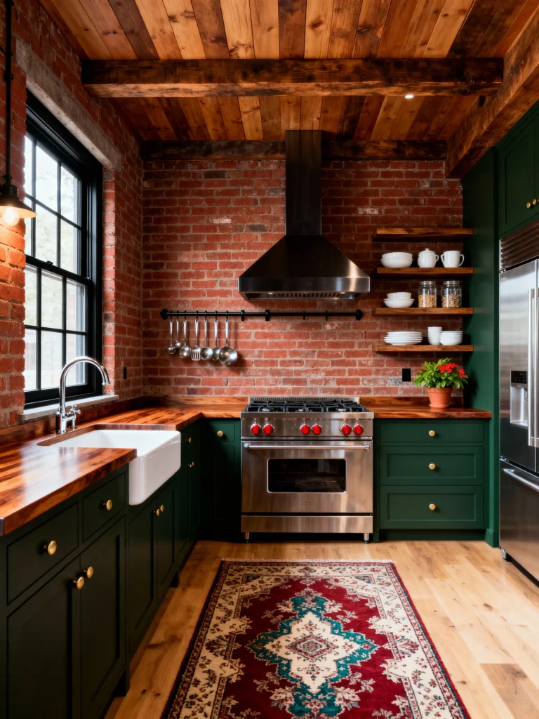 The combination of that rich, original red brick and the deep emerald green lower cabinets is just breathtakingly beautiful. The color palette is so sophisticated and warm. The stainless steel stove and hood provide a clean, professional focal point, but the wooden countertops and the classic area rug ensure the space feels incredibly inviting and homey. The open wooden shelves on the brick wall are perfect for displaying simple white dishware and cute jars, keeping everything accessible. It truly feels like a vibrant, welcoming spot for family and friends.