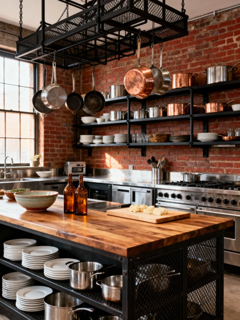 This kitchen is a functional chef’s paradise. The raw red brick walls set the stage for a true working kitchen, featuring wall-to-wall open shelving made of black steel, which is ideal for storing and displaying a serious collection of cookware. The huge butcher-block island, with its rugged, cage-like metal base, looks ready for any prep work. Hanging a pot rack above the island, especially with those beautiful copper pieces, is a smart way to maximize storage while embracing the factory-chic aesthetic. It’s a kitchen designed for making incredible food and sharing it!