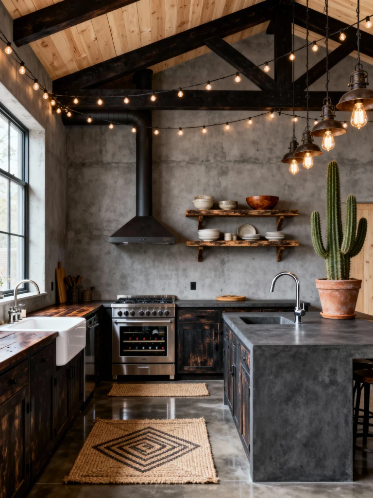 This space perfectly blends a farmhouse feel with an industrial shell. The dark, textured concrete walls and exposed black trusses are definitely raw and urban, but the rustic wooden ceiling, dark distressed cabinetry, and that gorgeous farmhouse sink bring in so much warmth. The fairy lights strung across the beams are a brilliant touch, adding a soft, bohemian glow that totally transforms the mood. And you can’t miss the giant cactus! It’s an unexpected focal point that gives the whole room so much personality. Plus, the little woven rugs add texture and warmth underfoot.