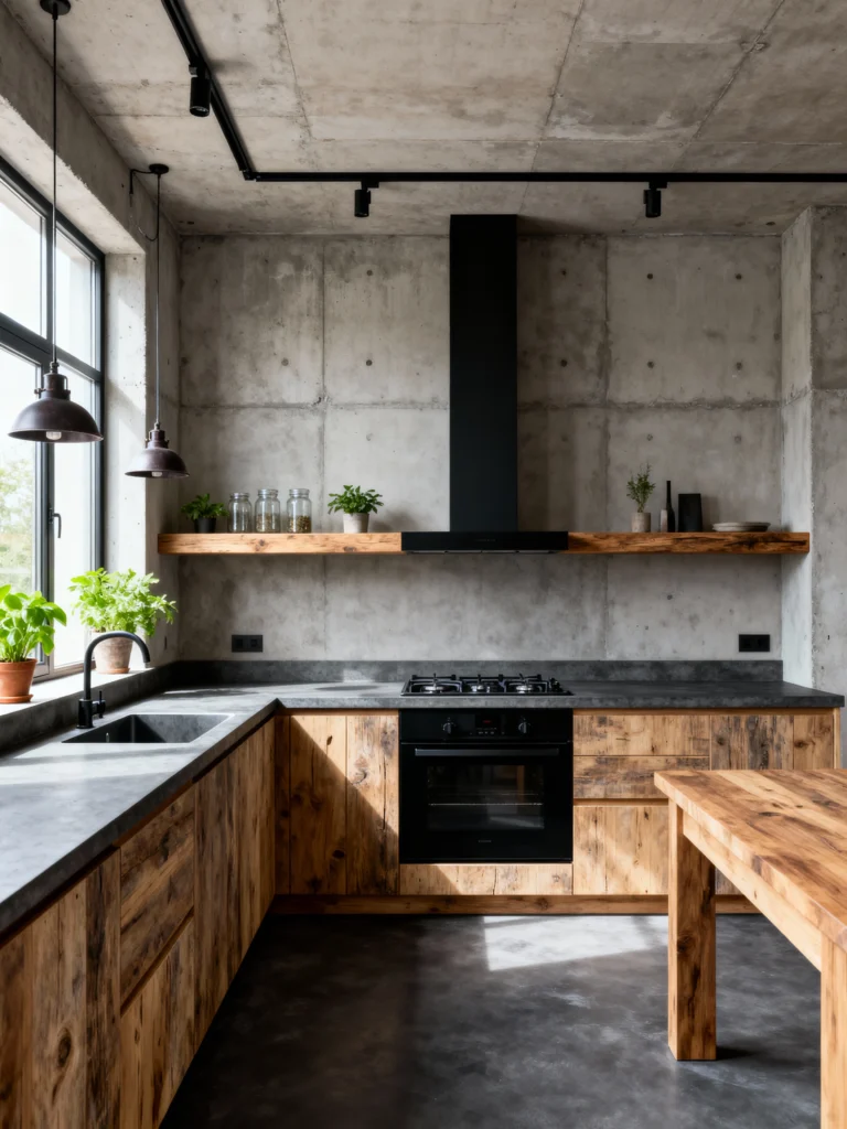 This space is all about concrete warmth. The raw concrete walls and ceiling give this kitchen a simple, honest, and truly minimalist industrial foundation. However, the use of beautiful, heavily textured, reclaimed-look wooden cabinets brings so much organic warmth and character. The black countertop and range hood are sharp and modern, grounding the whole look. It’s a perfect example of how to make a concrete space feel lived-in and comfortable, not cold. The small plants along the window sill and the open wood shelves add just the right amount of natural, inviting detail.