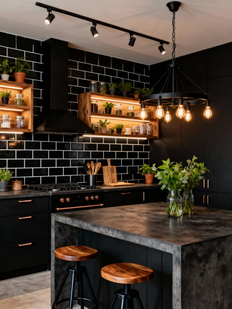 This kitchen is seriously chic and dramatic. The high-gloss black subway tile with white grout creates an amazing texture and shine, contrasting beautifully with the matte black cabinetry. The warm, rustic wood shelves pop against the dark wall, especially with the added under-shelf lighting that highlights the greenery and ingredients. And check out those copper accents—the hardware and the range trim—they add a flash of luxurious warmth. The chunky industrial chandelier with Edison bulbs finishes off this incredibly stylish, moody aesthetic perfectly.