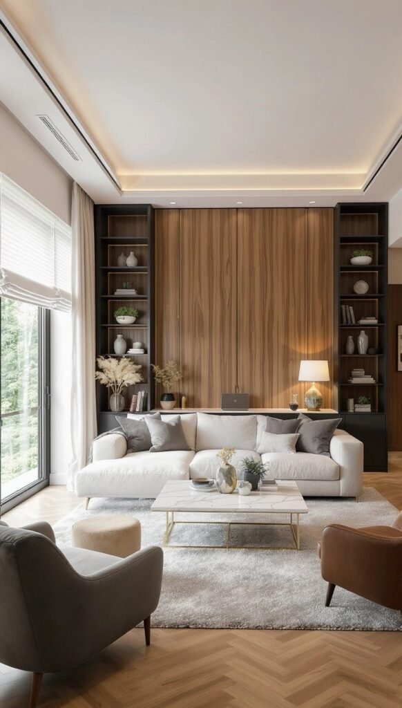 This room mixes warm wood tones with clean whites for a sleek, modern look. The subtle lighting and floor-to-ceiling wooden panels add a natural, grounding feel, while the neutral furniture keeps the space bright. It’s a very balanced and sophisticated room that merges modern design with natural, inviting textures.