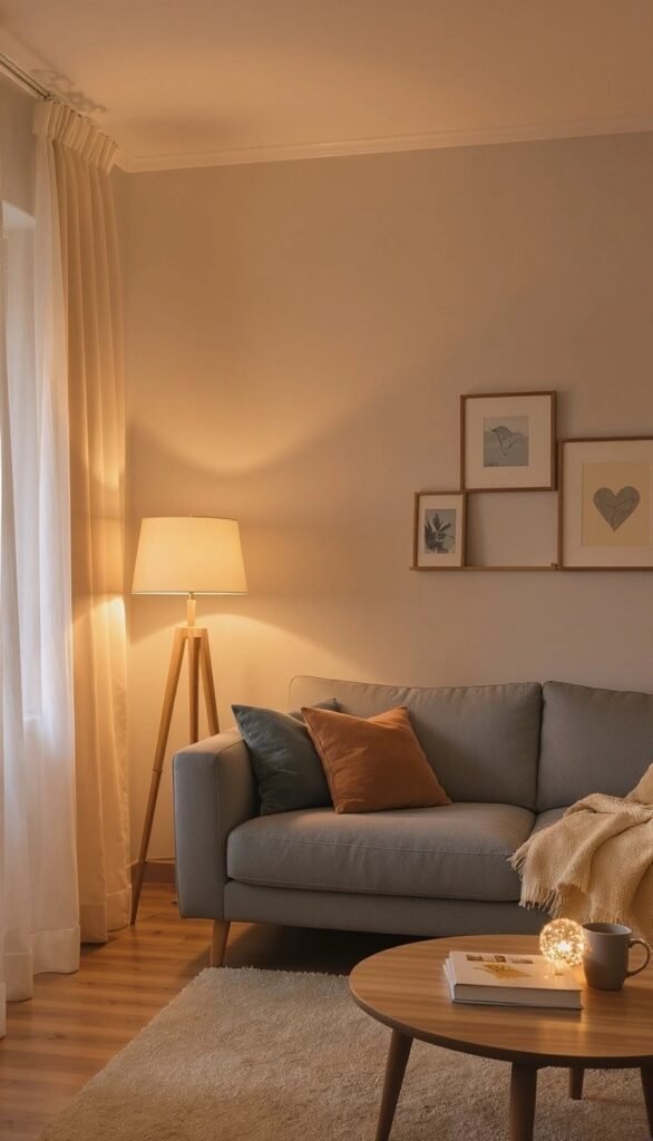 The room uses a simple palette of warm taupe, cream, and burnt orange accents to create an incredibly snug atmosphere. The soft lighting from the floor lamp and the sheer curtains enhance the warmth, making it feel like the perfect little spot to curl up with a good book.