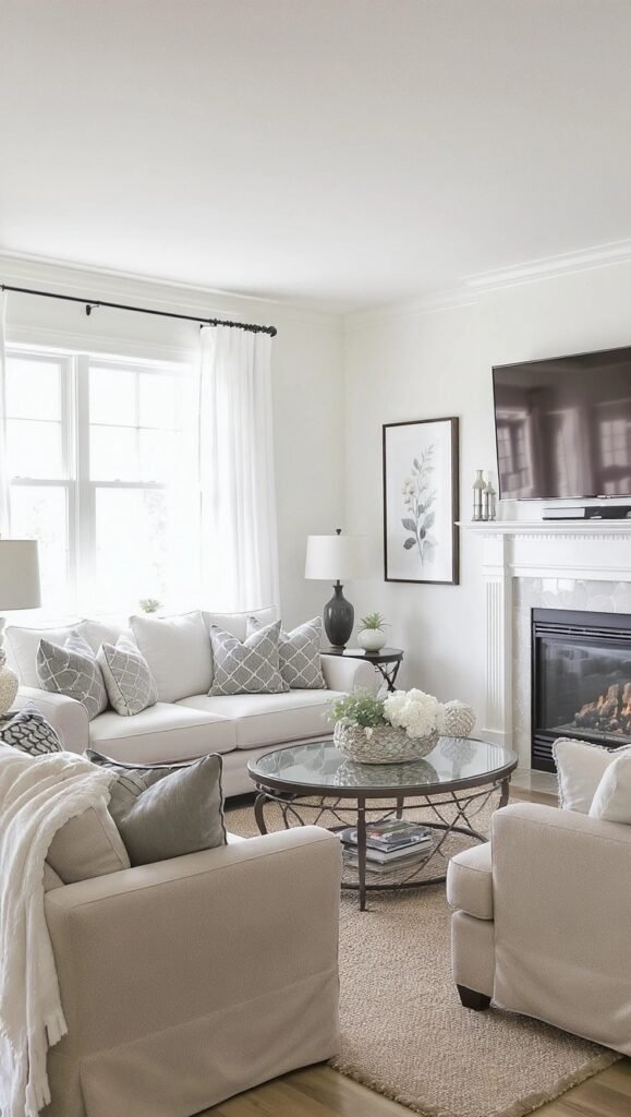 Talk about timeless elegance! This living room keeps things effortlessly chic with a palette of crisp whites, creams, and warm greys. The texture is key here, from the patterned pillows to the cozy throw blanket, preventing the neutrals from feeling flat. It’s bright, inviting, and feels like a beautiful, calm space to just sit back and relax.