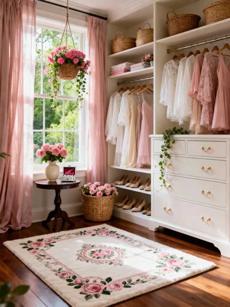 I love how the owner didn’t just stop at clothes; they brought the outdoors in with hanging baskets and fresh roses. It smells like a garden in here, I just know it! The rose-patterned rug pulls everything together, making the hardwood floors feel cozy. It’s a perfect reminder that your closet doesn’t have to be clinical—it can be a blooming sanctuary.
