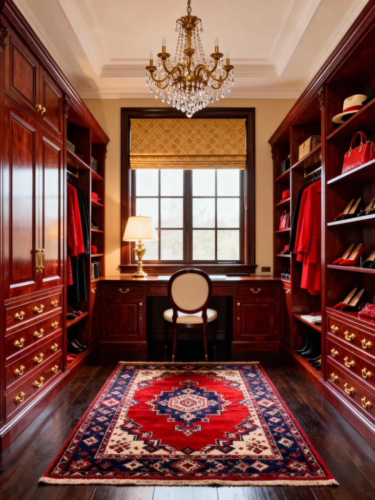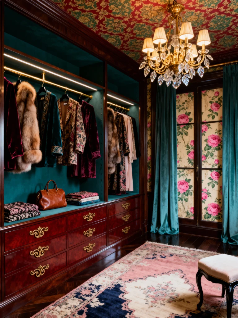 But the real star? The ceiling! Most people forget the “fifth wall,” but that red damask wallpaper up there makes the crystal chandelier pop. This feels like a room where you’d get ready for a gala or a secret moonlit dinner. It’s moody, it’s expensive, and it’s incredibly cozy. If you have a collection of faux furs or velvet blazers, this is exactly where they belong.