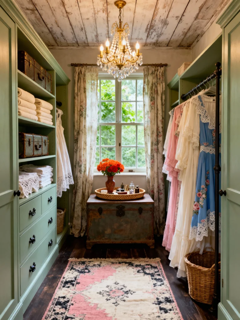 The weathered wood ceiling and the antique trunk by the window give the room so much character. It feels like a space that has been lived in and loved for decades. I especially love the floral curtains and the crystal chandelier—it’s a “shabby chic” mix that feels curated rather than cluttered. It’s proof that you don’t need a massive room to create a magical dressing experience.