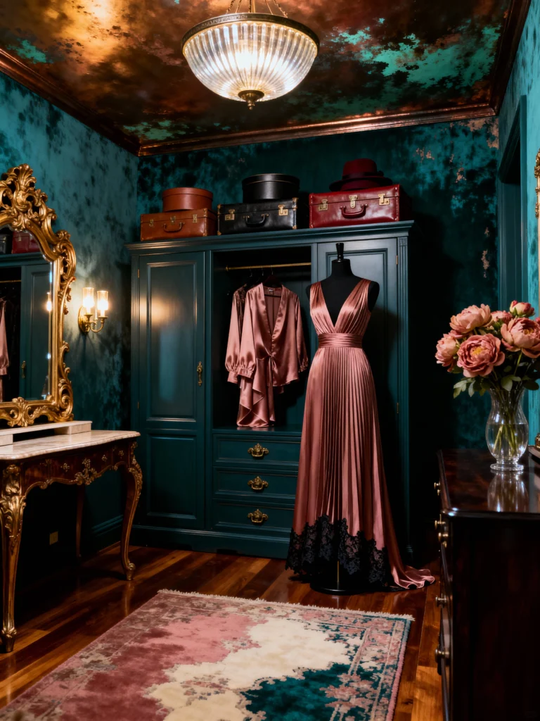 This room is pure art. The textured, metallic-finish teal walls are unlike anything I’ve seen. It feels like being inside a jewel box. If you have a wardrobe full of evening gowns and silk, you need a room that matches that energy.