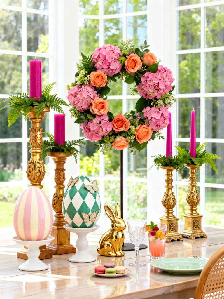 If you want your Easter brunch to feel like a high-end garden party, this is the one for you. This look is all about height and drama. Those tall, ornate gold candlesticks paired with vibrant fuchsia candles create an instant “wow” factor. I love how the central floral wreath acts as a floating centerpiece, keeping the table feeling airy despite all the decor. The mix of the harlequin-patterned egg and the shiny gold bunny adds a touch of whimsical luxury. It’s sophisticated, colorful, and definitely Instagram-ready!