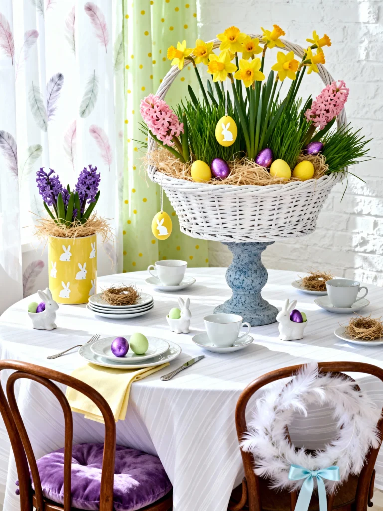 This setup is pure Easter joy! The focal point is that massive white wicker basket overflowing with daffodils and hyacinths—it’s like a spring garden in the middle of your table. I’m obsessed with the bunny-themed details, from the yellow vase to the tiny ceramic bunny egg holders. The purple velvet chair cushions add a rich, royal touch that makes the whole room feel special. It’s bright, cheery, and perfect if you’re hosting a brunch for kids (or just kids at heart).