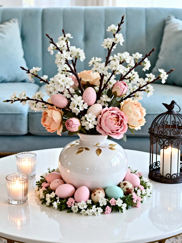 If you prefer a minimalist or “Cottagecore” aesthetic, look no further. This coffee table setup proves you don’t need a huge dining table to celebrate. The simple white vase with cherry blossom branches and peonies is so elegant. Placing a ring of pastel eggs around the base of the vase is a genius way to ground the centerpiece. The addition of the birdcage candle holder and soft pink tones creates such a calm, serene atmosphere. It’s perfect for a quiet Easter morning.