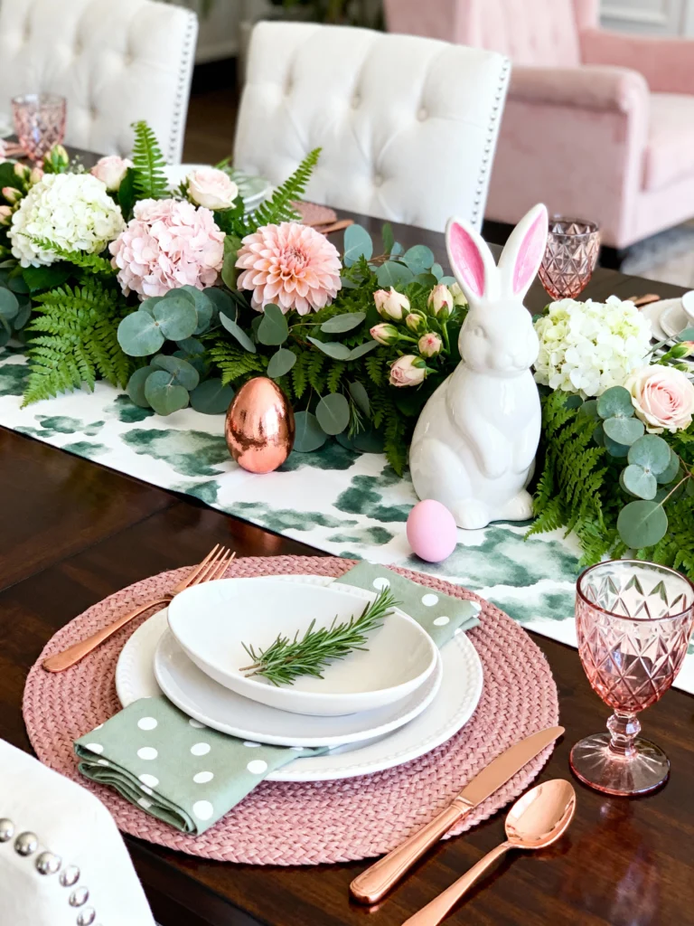 This is for my friends who love a bit of “shabby chic” romance. The lush floral runner with dahlias and eucalyptus is absolutely breathtaking. Using rose gold or copper flatware really elevates the look, especially when paired with those pink textured glasses. The large white ceramic bunny standing guard over the meal is such a cute touch. It feels very “secret garden” and would be perfect for a celebratory Easter lunch.
