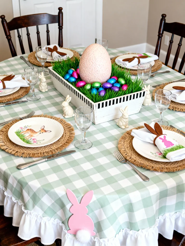 Nothing says “picnic” quite like gingham! This green and white checkered tablecloth sets a fun, relaxed tone immediately. I love the creative napkin folding—turning them into bunny ears with little brown felt accents! The centerpiece is a rustic wooden box filled with bright green grass and a giant pink egg, which is such a fun conversation starter. It’s a very tactile look with the woven placemats, making the whole table feel textured and lived-in.