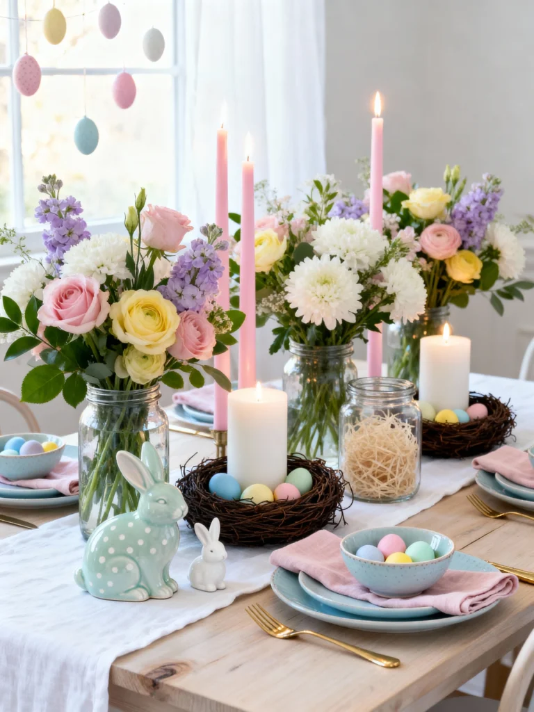 This is the quintessential Easter look. It’s all about soft blues, pinks, and yellows. Using mason jars as vases is a great way to keep things looking “collected” rather than “stuffy.” I love the hanging egg garland in the background and the little bird’s nests used as candle holders—it brings so much nature indoors! The gold cutlery adds just enough sparkle to keep it from looking too casual. It’s a sweet, timeless style that everyone will love.