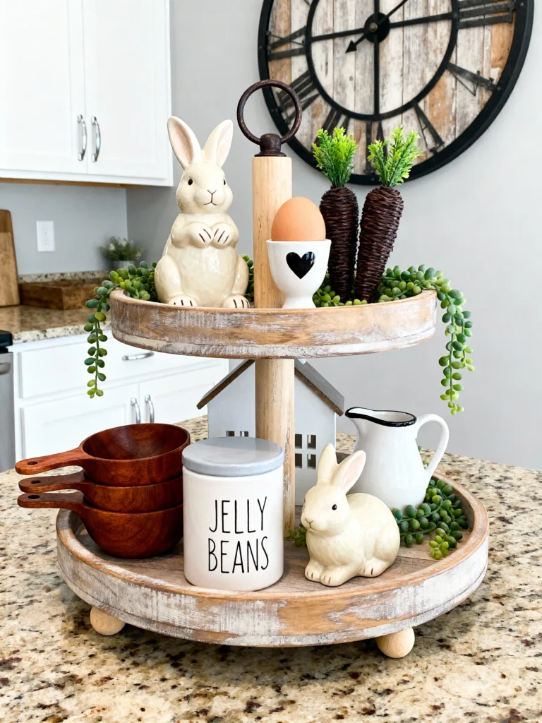 Short on space? A tiered tray is your best friend! This is a great way to display your Easter treats and decor on a kitchen island or small buffet. The mix of natural wood, white ceramic bunnies, and those “jelly bean” canisters creates a lovely farmhouse vibe. I especially like the “carrots” made from twine—they add a great pop of texture and color. It’s functional, cute, and stays out of the way of the actual food!
