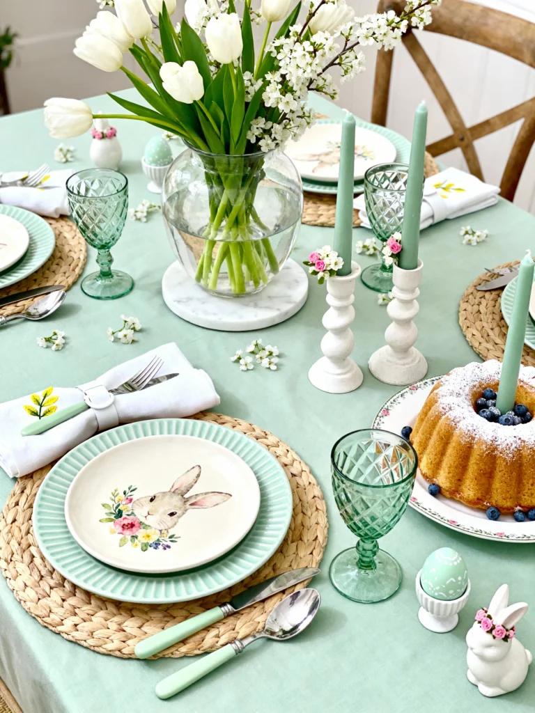 This setup feels so crisp and clean. The mint green tablecloth is the perfect backdrop for those bunny-illustrated plates. Bundt cakes are always a classic Easter dessert, and using one as part of the table decor (complete with a candle!) is a pro move. The white tulips and green glassware keep the color palette tight and sophisticated. It’s a cheerful, cohesive look that makes the whole room feel like it’s finally spring.