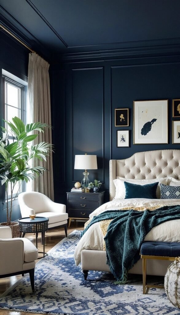 Wow, this is drama in the best way! The deep navy walls and trim create an incredibly rich, luxurious atmosphere. Paired with the crisp white bedding, the tufted headboard, and the jewel-toned rug, this room is pure elegance. It proves that dark colors can be completely welcoming. That huge window helps keep it from feeling too heavy—absolutely stunning!