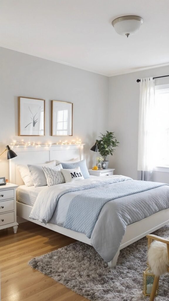 Talk about a cheerful space! The combination of crisp white furniture, light gray walls, and soft blue accents feels incredibly fresh. The string lights above the white headboard add a little bit of playful charm, and the fluffy gray rug makes getting out of bed a little easier. This is a classic, inviting farmhouse look that’s perfect for a bright morning.