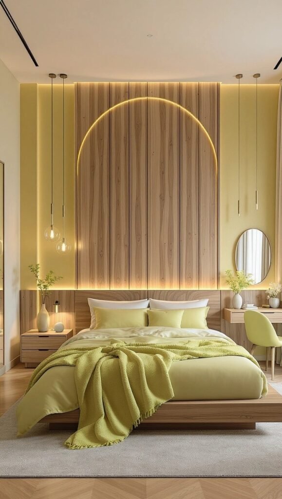 This room is bright and modern with a playful twist. The muted yellow walls pair perfectly with the warm wood paneling and that striking, lit arch. The matching yellow bedding and throw blanket pull the whole look together, making it feel cohesive and vibrant. It’s a wonderfully cheerful escape!